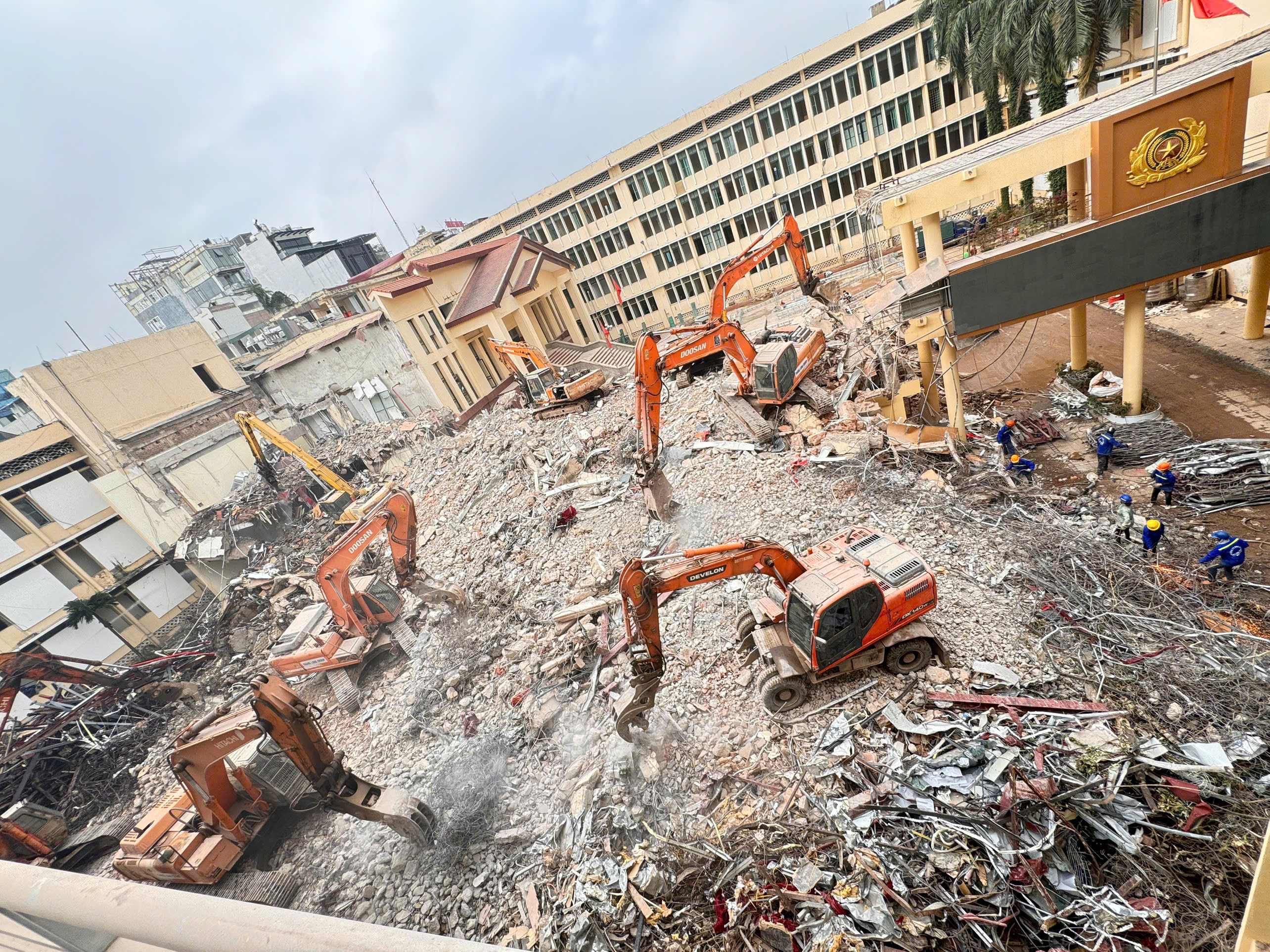 Phá dỡ dãy nhà 3 tầng thuộc Cục Hình Sự được triển khai cẩn trọng, tuân thủ nghiêm ngặt quy trình an toàn, đảm bảo an ninh khu vực và không ảnh hưởng đến hoạt động xung quanh.